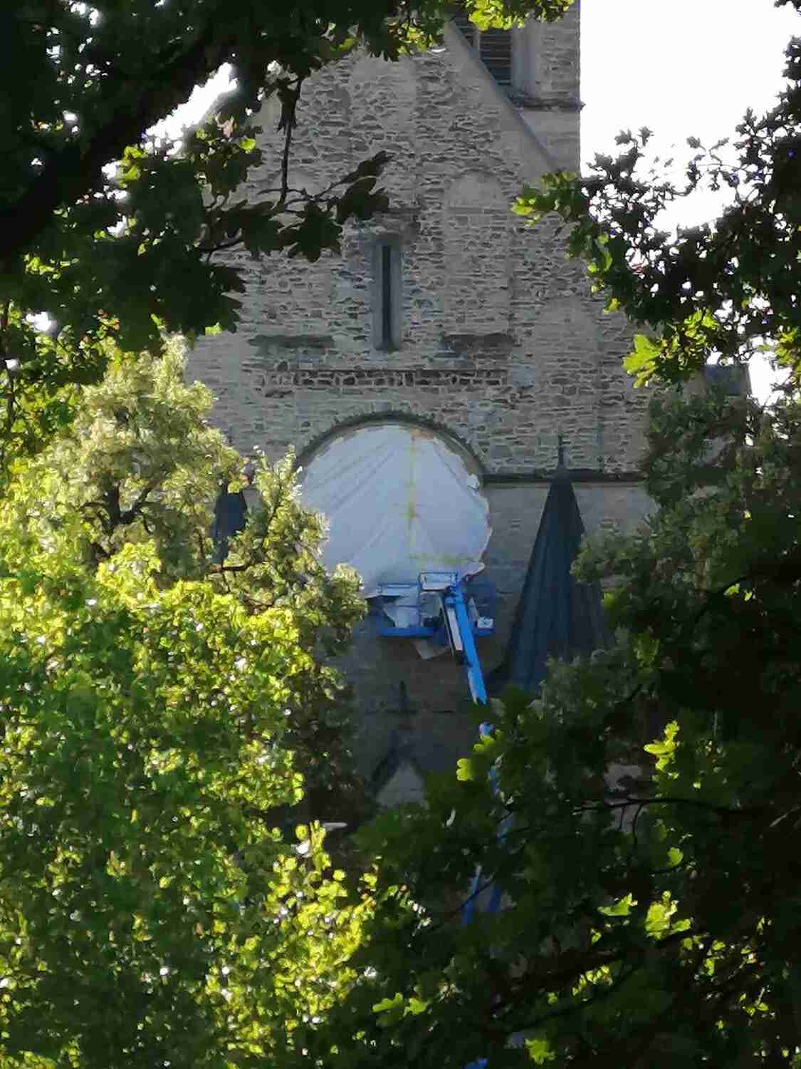 Unsere Pfarrkirche ist nunmehr über 120 Jahre alt und leider haben sich letztes Jahr – vermutlich auch aufgrund erhöhter Erschütterungen – einige Sandsteinelemente in der Rosette gesetzt. Dadurch kam es zu starken Verbiegungen der Bleiverglasungen, die nunmehr abzuplatzen drohten.